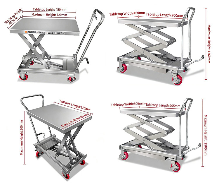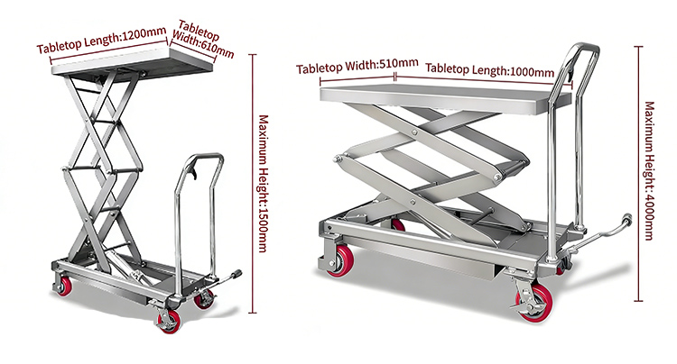 2. 構造および機能のカスタマイズ: 手動または電動/油圧のオプションが利用可能で、折りたたみ式ガードレールや全方向サイレント ホイールなどの追加も可能です。限られたスペースでは折りたたみ可能な本体設計が利用でき、危険な環境では防爆設計を追加できます。